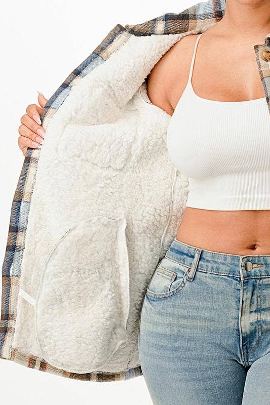 Fur lined plaid flannel shirt jacket shacket with pockets