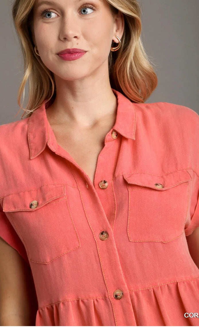 Snow Wash Tortoise Shell Button Down Top with Unfinished Frayed Hem, & Chest Pockets