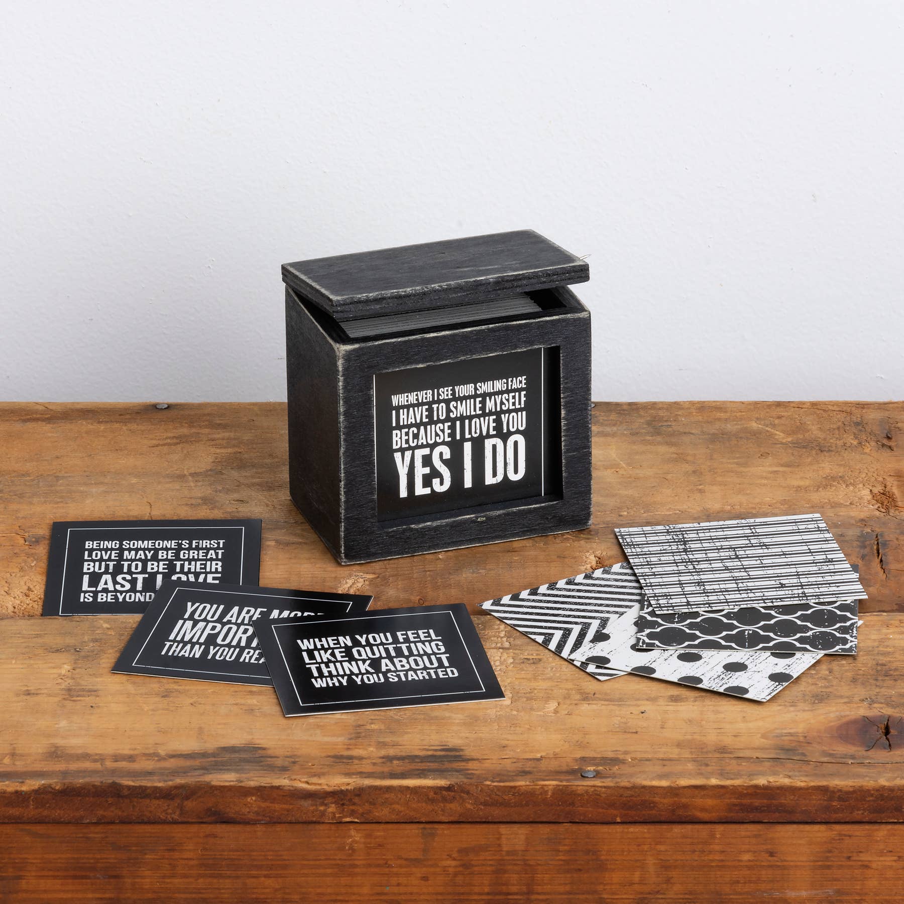 A black and white wooden hinged box with 80 double-sided cards featuring 80 inspirational phrases for daily encouragement and motivation. Complements well with coordinating design pieces for an uplifting collection.