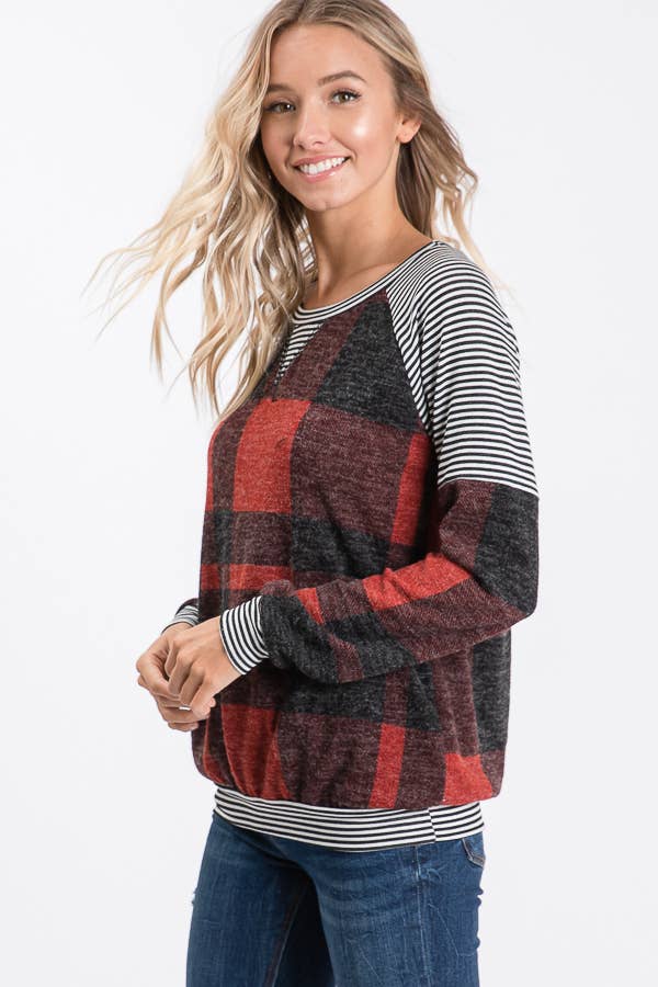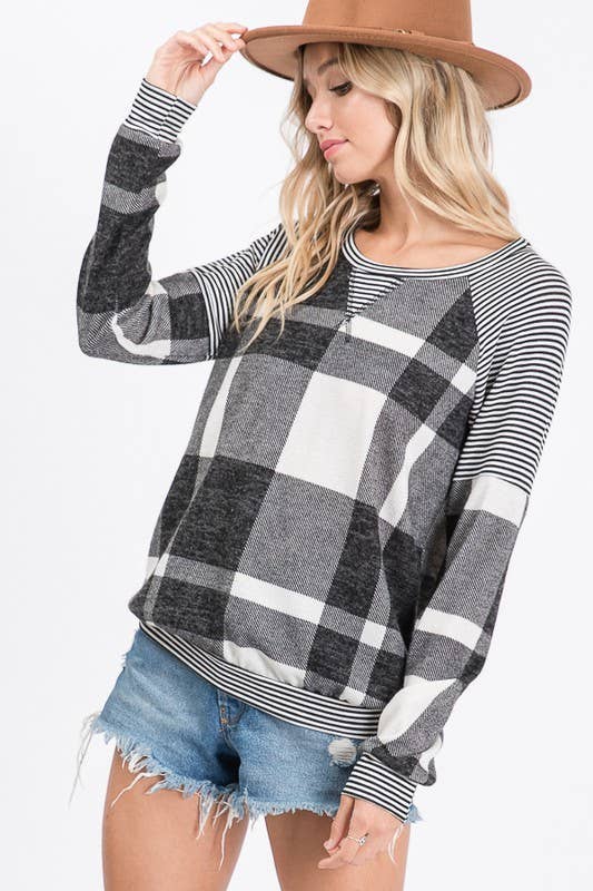 Mohair Brushed Plaid Print Sweatshirt Contrast with Pinstripe Shoulder Detail