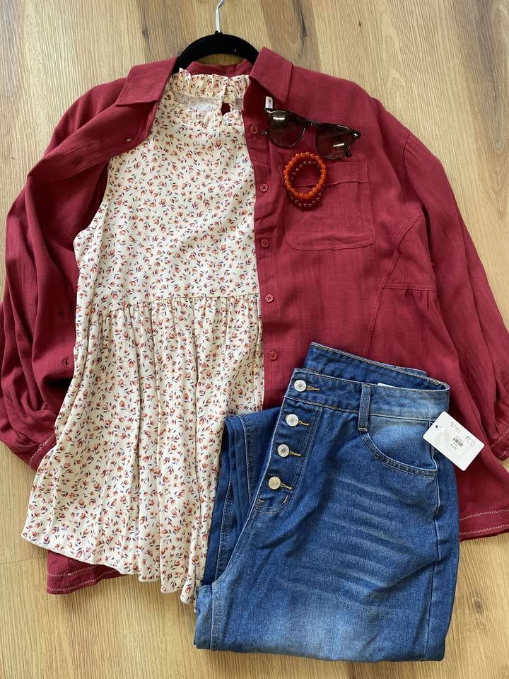 This sleeveless tunic tank is made of a soft rayon material. Features an all over floral print, has a mockneckline, a babydoll body. Flowy, and roomy fit.