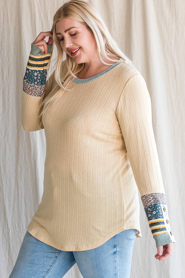 A RIBBED KNIT TOP FEATURING BUTTON DETAIL, LACE TRIM, COLOR BLOCK SLEEVE, ROUND NECK, AND LONG SLEEVES.