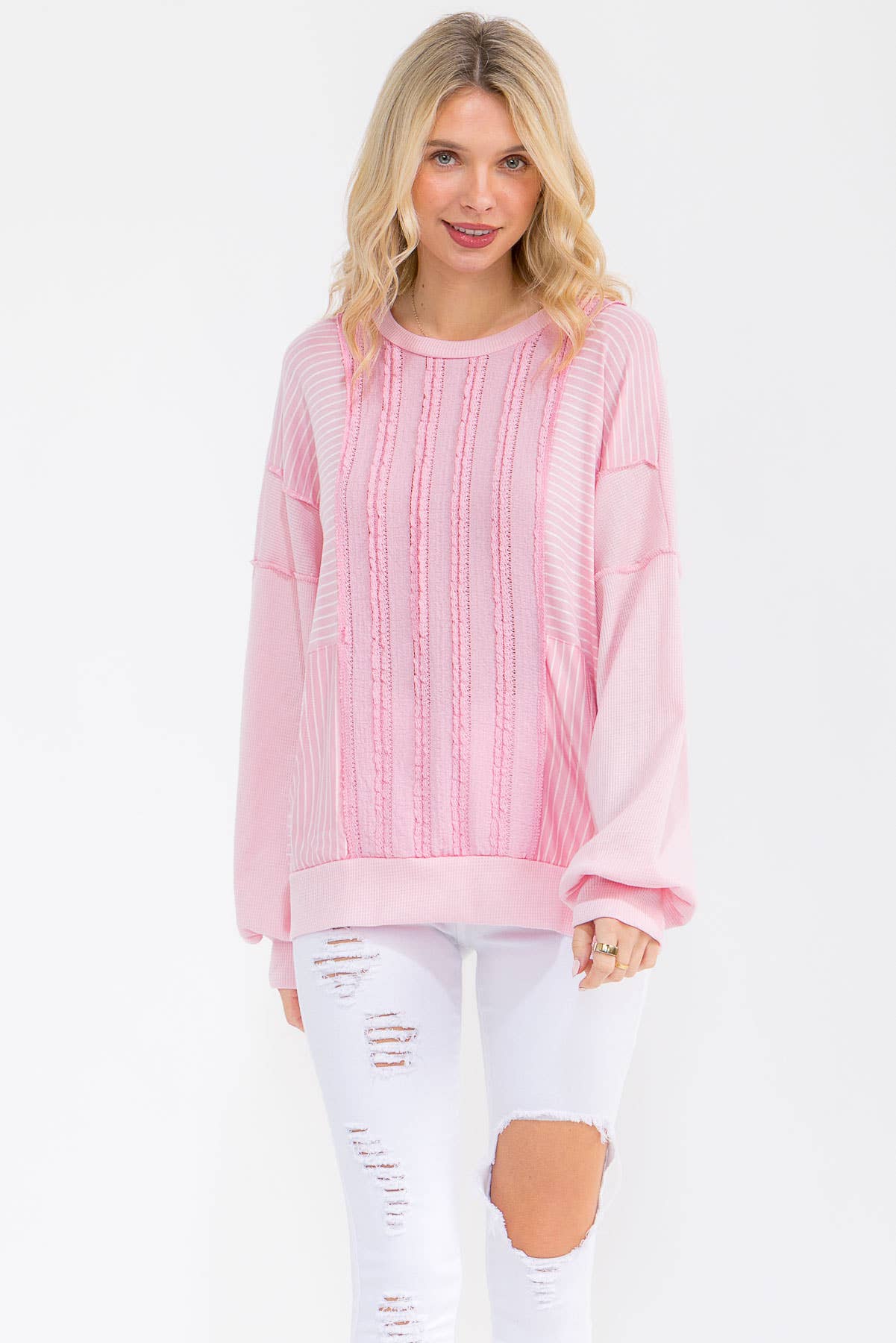 EFFORTLESSLY STILISH THIS TEXTURED STRIPE KNIT TOP FEATURES A MIX MEDIA DETAIL WITH SUBTLE MIXED STRIPE PANELS FOR ADDED DEPTH AND VISUAL INTEREST. THE FRONT SHOWCASES DELICATE VERTICAL TEXTURE DETAILING, SIDE POCKETS, RELAXED FIT AND DROP SHOULDERS TO CREATE AN EASY COMFORTABLE SILHOUETTE.